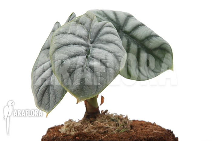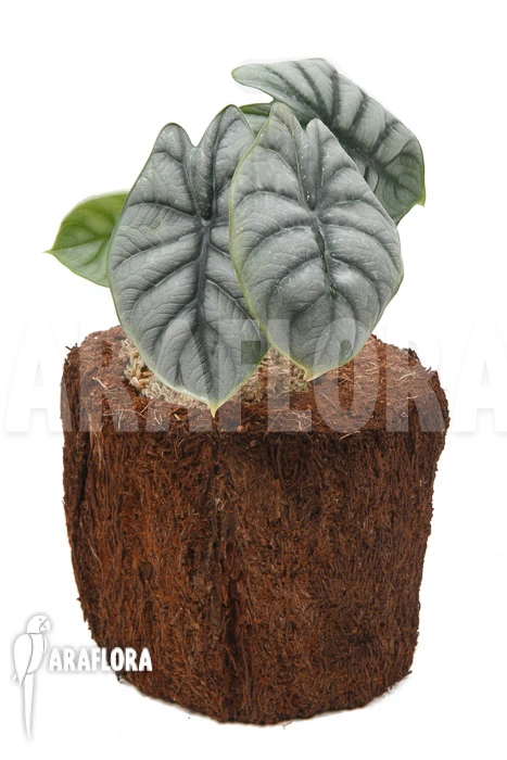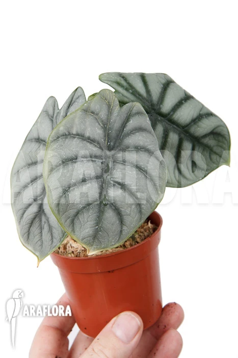 Alocasia baginda is native to the humid tropical forests in Borneo. The plant can grow to about half a meter in height. Much of this length is taken up by the huge arrow-shaped leaves. The upper side of these leaves is dark green and has a shiny glow. The underside hides a striking purple-colored vein system. Alocasia baginda has a characteristic white flower, a rod with numerous small flowers is surrounded by a specially shaped leaf.