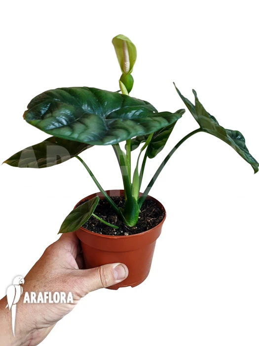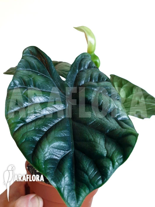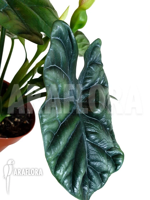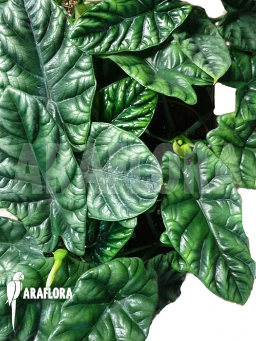 Alocasia sinuata is a terrestrial plant species that sprouts from a tuberous root in the soil. For every leaf this plant has a light-colored petiole. Leaves can grow to a maximum length of 30 cm. The arrow-shaped leaves have a dark green color. Younger leaves have a light-green base color with darker veins. The veins of adult leaves are sunken into the leaf area. The leathery leaves are shiny when young and lose this shine with older age. It is possible for the leaf margins to be undulating, although this is not always seen. The unspectacular eyeing inflorescence appears infrequently and looks similar to other aroids within this family. In some cases, this plant could lose all its leaves and could resprout from its tuber, after a rest period. Propagation is most often done by young offshoots from the base of the plant but is also possible with seed.