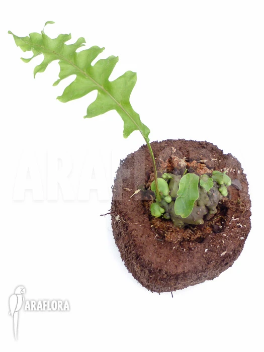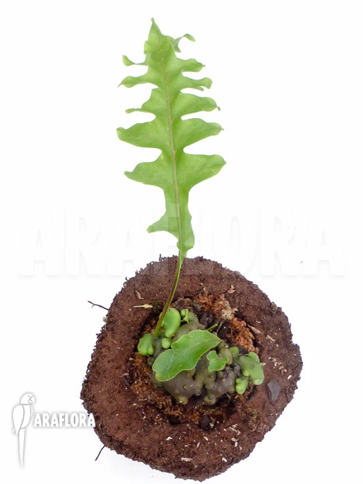 In its natural setting, Lecanopteris celebica has a mutually dependent or symbiotic relationship with different types of ants. Plants derive nutritional benefit from food sources that ants bring into the rhizome in return for shelter. However, when cultivated as a house plant, Lecanopteris celebica does not need ants. While a plant is still young, its rhizome is solid (without cavities), but as it matures, openings start to form, creating a hollow internal space that can be used by ants. In the wild, Lecanopteris celebica grows on the Indonesian island of Sulawesi. This type of ant fern is an epiphyte meaning it grows on other plants, usually trees. Lecanopteris celebica does not produce flowers but like other types of fern, reproduces by means of spores which form on the undersides of its leaves. The plants supplied by Araflora are of a manageable size.