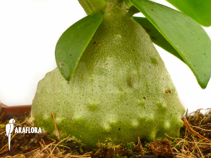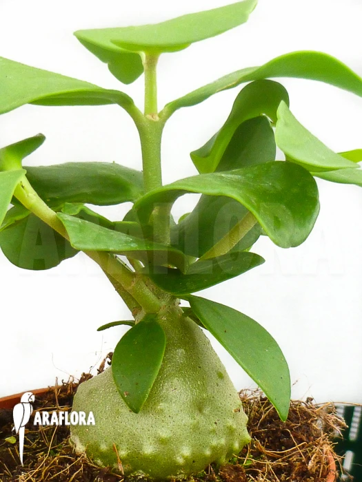 Hydnophytum cf. mosleyanum is found in nature growing on trees in the tropical rain forests of Indonesia, the Philippines and the northern parts of Australia. Compared to other species, Hydnophytum cf. mosleyanum has a reasonably large caudex (max. 25 cm), which is relatively smooth. The ants living in it deposit waste which is beneficial to the plant. The plant has slightly succulent leaves and makes long, thin stalks which will form a nice and compact whole if pruned. In the axil of the leaves small, subtle flowers can grow, which are followed by yellow-orange to bright red-colored berries.