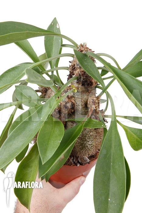Myrmecodia beccarii plays host to two types of creatures in its swollen tuberous stem. As well as being colonised by ants, it is used by a butterfly which lays its eggs on the plant. The ants carry the eggs inside the plant because they smell like ant’s eggs. The ant plant produces very small white flowers in the axil of its large, shiny leaf petioles. Once the flowers have finished, they turn into red berries. It grows to a height of roughly 80 cm.