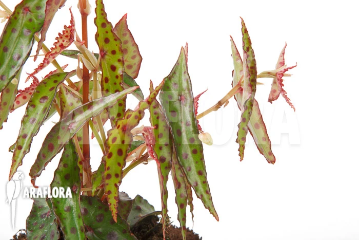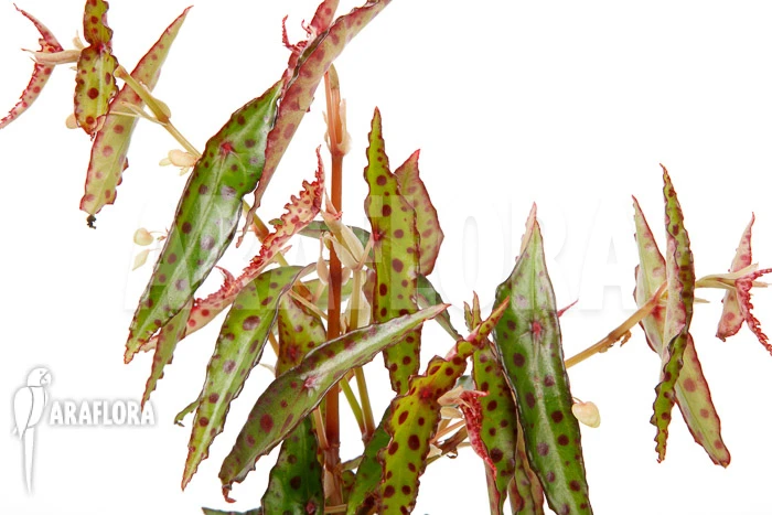 Begonia amphioxus ‘Butterfly’ originates on Borneo, Indonesia. The leaves, when moved by the wind, resemble butterflies. This species was not described until Martin Sands of New England’S Royal Botanical Garden did so in 1990. The scientific name comes from ‘amphi’ which means ‘both’ and ‘oxys’ which means ‘pointy’. The Begonia amphioxus belongs to the bushy or shrubby Begonias.