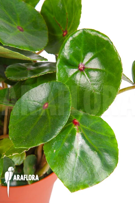 Begonia conchifolia var. rubrimacula originates in Middle America. In Latin ‘Rubrimacula’ means ‘Red spot’ ‘‘conchifolia’ can be explained by ‘konche’ ‘Greek’ crustacean and ‘folia’ ‘Latin’ ‘leaf’’. In English it is also known as Bull’S Eye Begonia. It is a rhizome-forming Begonia.