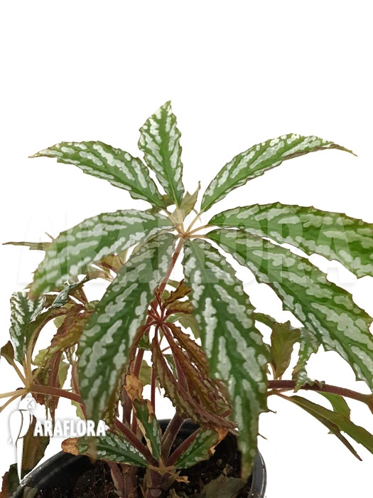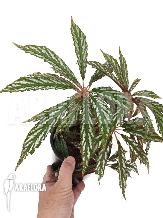 Begonia hemsleyana โVariagataโ is a rare subtropical plant from the Yunnan, China. This plant grows up to about half a meter and stands out because of its extraordinary leaves. These are palmate and consist of a maximum of eight leaflets. Leaflets are elongated, ovoid and have a serrated leaf margin. The main color of the leaves is dark green with a bright silver spotted pattern. The underside of the leaves are red to purple. Leaves are carried by a red, hairy petiole which grows from a rhizome below ground. When mature, the plant produces pink flowers with a yellow center, that are either male or female. Propagation is easiest by taking cutting of larger stems or leaves. When both sexes of flowers are present, it could be propagated by seed as well.