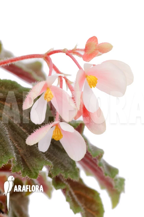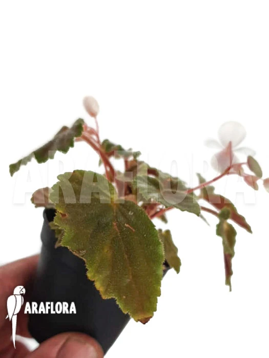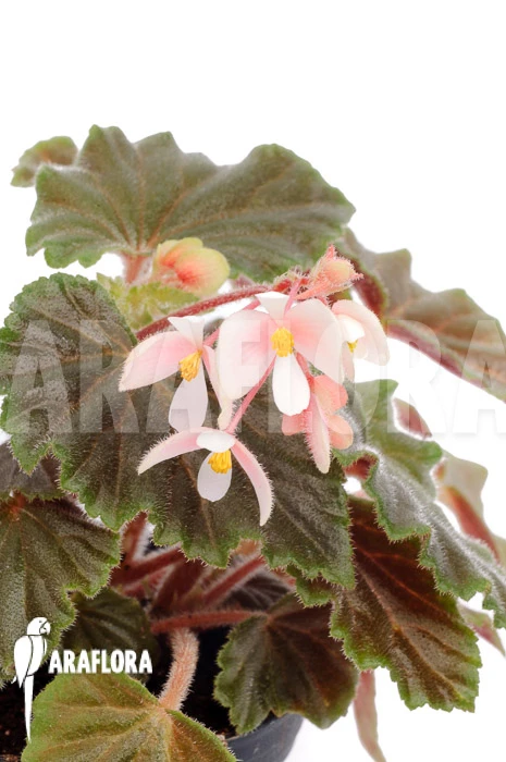 Begonia schmidtiana is a rare subtropical plant originating from Brazil. This plant is characterized by its sideways stalked, droplet shaped leaves, as with most begonia species. Leaves are carried by notable, red-colored petioles. The base coloration of the hairy leaves is dark green. At some angles, a faint blue shine could be seen over the leaves. When the leaves are developing, they show a burgundy to red color. When mature, it could form a small bush that grows up to a meter in height. The plant produces light pink flowers with a yellow center, that are either male or female. Propagation is easiest by taking cutting of larger stems. When both sexes of flowers are present, it could be propagated by seed as well.