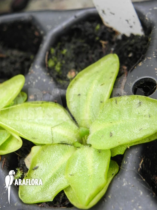 Pinguicula poldinii is a carnivorous plant from the family lentibulariaceae. It originates from a couple of locations in Italy only. The plant produces a rosette of egg shaped to oval, brightgreen leaves. On the upper side of the leaves, it contains many glands producing a sticky substance where insects could be caught with. The insects are digested on top of the leaves, the nutrients available are used by the plant. Once per year, mostly in spring, one to several flower stalks are produced carrying a single purple, spurred flower. Flowers are somewhat similar to the flower of a violet. In winter, Pinguicula poldinii could hibernate by reducing the whole plant to the underground rhizome. Propagation is done by repotting the smaller rosettes forming near the base of the mature plant, or seeds.