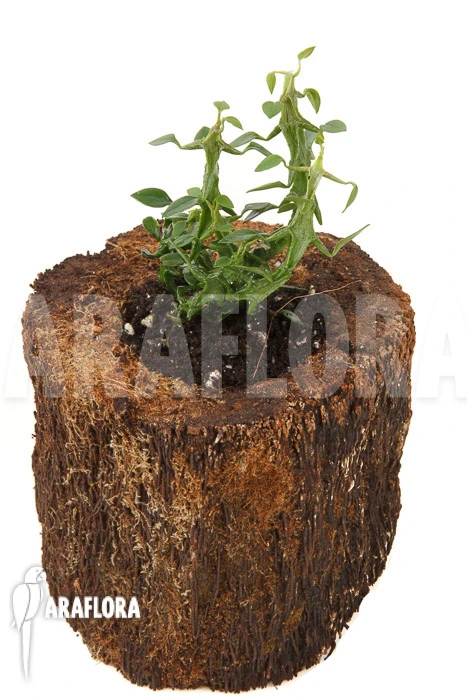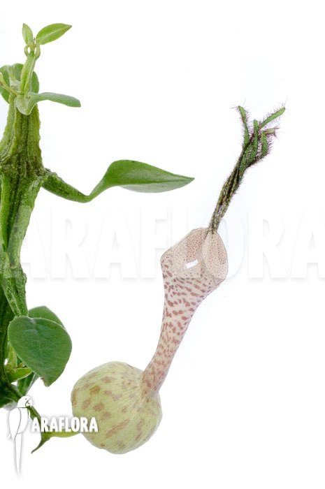 Ceropegia simoneae is a semi-succulent plant that will produce several main stems that will have leaves all along its stem. It is a rather compact growing plant, but over time it can still reach a considerable height. When it really starts to trail, you could provide it with some support to guide it during its growth or you can just keep it as a hanging plant in a basket. Ceropegia simoneae is native to the beautiful surroundings of especially southern Madagascar, where it grows in extremely parched circumstances. The leaves of Ceropegia simoneae donβt grow big but they are rather thick and have a really tough structure. That is why Ceropegia simoneae is able to survive in really arid environments. With a bit of luck your plant will produce some stunning flowers during summertime when you provide it with the right conditions. The flowers are amazing, they are rather big relative to the size of the leaves and they are weirdly looking. Close to their base they form a small cup which will change into a narrower pitcher, the flowers will also produce new growths. The flowers will be white with red to purple spots all over them. Altogether, this plant is really unique and eccentric making it a true showpiece according to Araflora.