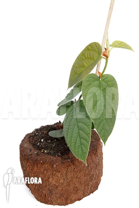 Ficus villosa is a fig species from the warm and humid forests of Southeastern Asia. When a young plant sprouts, it directs itself to the nearest tree trunk and vines upwards. When this species reaches maturity, it could grow as a liana, hanging from tree branches. The oval to heart shaped leaves are hairy and wrinkled. Young leaves have a purple to reddish color and when the leaves mature, they become deep green. Ficus villosa produces small white flowers that are either male or female. When pollinated successfully, small fig-like fruits are formed. The most common way of propagating this species is by taking cuttings. Be aware that the latex from this plant could be irritating to the skin. Root the cuttings in specialized soil or in water.