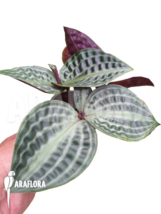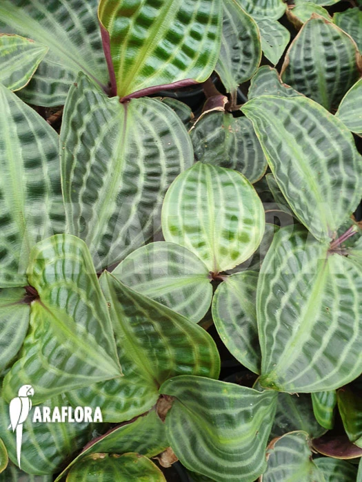 Geogenanthus poeppigii originates from damp forests of Southern America. It grows there only at the forest floor. This species is closely related to the better-known genus and common houseplant Tradescantia. The plant consists of a stout stem with two or sometimes three terminal leaves. The leaves of this plant are almost round and have an unusually ribbed leaf structure. From the petiole and parallel with the central vein, darker stripes lead to the tip of the lighter colored leaf. The lower surface of the leaves are slightly hairy and purple. In some cases it is possible for this plant to produce flowers. Flowers have a purple to blue color and, similar to other species within this family, have three petals. Propagation is most easy by cuttings. Cut the main stem with one or two leaves and place this in water or soil to root.