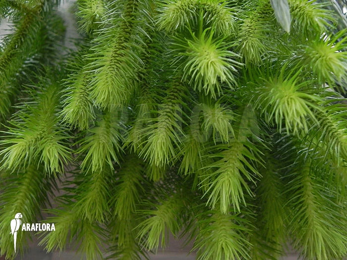 Huperzia squarrosum grows down towards the ground rather than upwards. Planting or potting needs to take into account the fact that it can grow to a length of 1 metre. Like other members of the Huperzia family it does not produce flowers. Huperzia squarrosum propagates itself by producing spores between the base of its leaves and their stems.