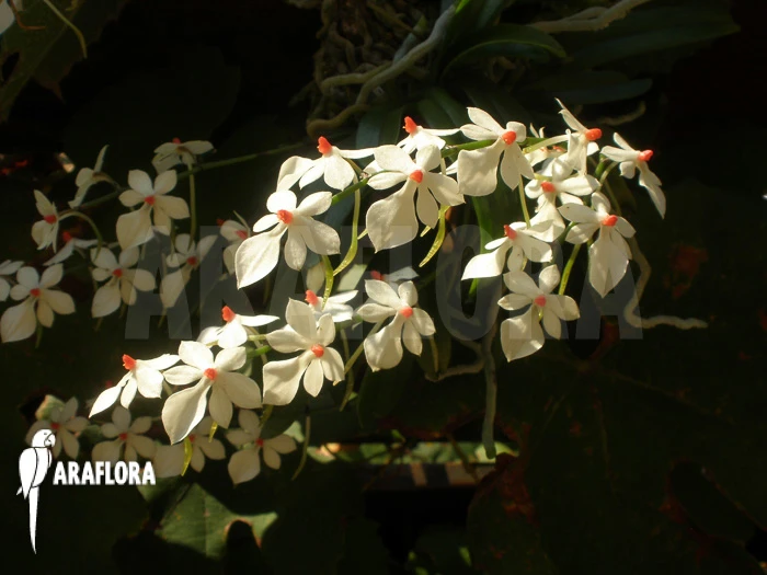 Aerangis luteoalba var. rhodosticta is a small to medium sized species from the orchid family. This monopodial species forms fleshy, oval-shaped, dark green leaves, somewhat narrower than Phalaenopsis for example. It uses its thick, flattened roots to anchor itself to its substrate. In winter to spring, this species is able to flower. Mature plants could produce one or more pendant inflorescences that could reach 40 cm in length under ideal circumstances, carrying up to a dozen flowers. The strongly scented flowers are creme white as base color with a relatively long spur. All flowers show a notable bright orange centre, which contrasts strongly with the rest of the plant. This species could be propagated by separating younger individuals from the mature plant.
