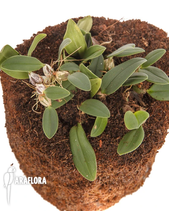 Bulbophyllum bolsteri is an epiphytical miniature orchid that only grows on some islands of the Philippines. It has a sympodial growth form. The pseudobulbs of this orchid are oval to egg-shaped and are around one centimeter when mature. There is some distance between each pseudobulb, hence the rambling nature of this plant. From every pseudobulb, a solitary, deep green, leathery, lanceolate leave is formed. This species could flower year-round, with the most chance in summer and the begin of autumn. The orchid produces an inflorescence of around 12 cm long, carrying a spectacular flower. The lower sepals are light-colored, with contrasting vertical bright purple striations. The rest of the flower is intense yellow with some dark purple patterns that could vary a bit per plant. This species is best to propagate by division. Make sure that every division has at least four healthy and mature pseudobulbs.