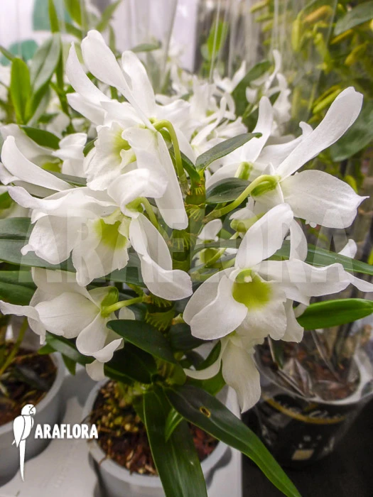 A hybridization of Dendrobium nobile can be recognized by the thickened stem at the base of the plant. These round ‘reservoirs’ serve as storage for nutrition and water. The flowers of Dendrobium nobile grow in clusters of two or three flowers on the older, leafless thicker stalk parts.