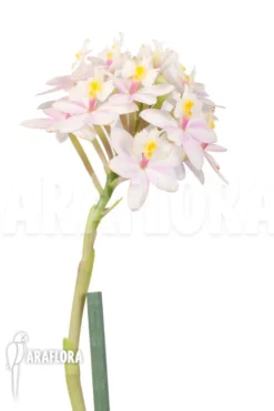 Epidendrum radicans occurs in the cool mountainous regions of Central America. The plant can grow to about 40cm. The lanceolate leaves alternate up the base of the flower stem. There can be more than ten different flower stems on a plant, with flowers growing in bundles at the end of these stems. The petals are pink and the serrated lip provides a yellow accent resembling a flame.