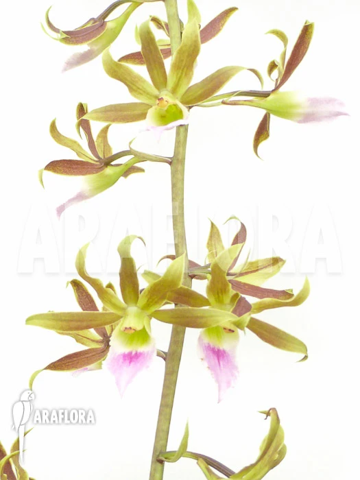 A hybridization of Dendrobium nobile can be recognized by the thickened stem at the base of the plant. These round ‘reservoirs’ serve as storage for nutrition and water. The flowers of Dendrobium nobile grow in clusters of two or three flowers on the older, leafless thicker stalk parts.