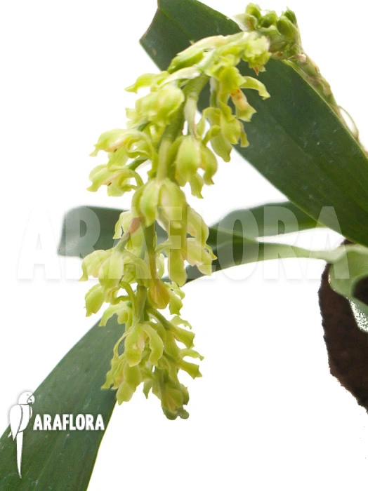 Gomesa crispa is a small to medium sized, sympodial orchid. From every flat, droplet-shaped pseudobulb, two to three sharp lanceolate leaves are produced. From summer till autumn, this species is able to produce one to multiple 20 cm long inflorescences. Every inflorescence could hold up to 60 flowers each. The main color of the 2 cm long flower is a light yellow to a light green. The tepal of the flower is deeply undulating, hence the name of this species. The top side of the labellum has a subtle orange marking. Flowers produce a pleasant scent, especially in the evening. Propagation is easiest by division of older plants. Make sure that every division contains at least three pseudobulbs.