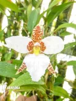 Lemboglossum rosii has its natural habitat in Nicaragua, El Salvador, Mexico, Guatamala and Honduras in humid forests at altitudes from 2.000 to 3.000 meters. The flowers of the plant are quite striking and can reach up to 8 centimetre in size. They grow from flower stems of around 15 centimetre in clusters of four. They are white with a brown spotted pattern. This pattern is completely spread on three petals and partly on two. The lip is quite fragile and crumpled with a bright white colour. The column (part holding the pollen) can be purple in some cases. The leaves of Lemboglossum rosii grow from bulbs and have an oval shape.