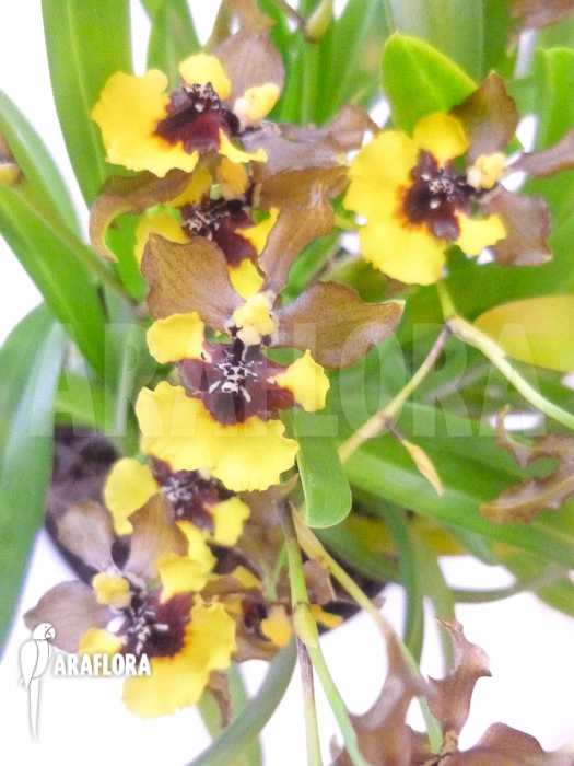 Oncidium eurycline is found in Brazil at altitudes in a moderate to warm climate. The flower stems stick out above the leaves, growing from slightly flat bulbs. They are quite slender with a pointy end. Oncidium eurycline can grow multiple flower stems, each holding multiple flowers. Part of the flower petals are yellow and the other part are brown. At its centre, the flower is white with yellowish brown spots. The flowers reach around 2,5 centimetre. This orchid is also referred to as Oncidium croesus.
