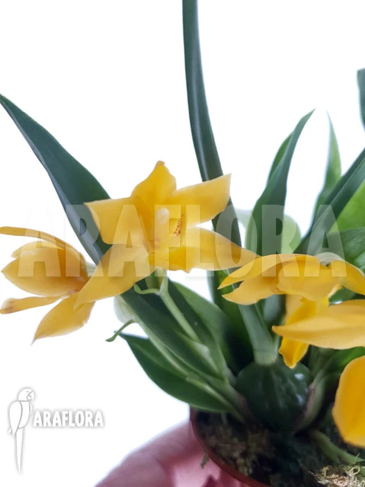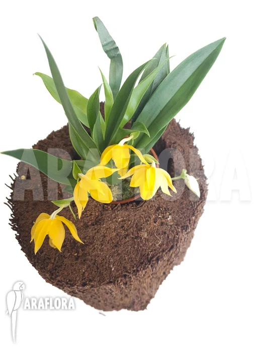 Promenaea silvana is a medium sized sympodial orchid. The rounded to ovoid pseudobulbs grow relatively close to each other. Each pseudobulb carries two sharp lanceolate, bright green leaves. This species could produce flowers from the end of spring to the beginning of summer. The single flowered inflorescences arise from the base of the pseudobulb. The flowers reach a maximum size of around 4 centimeters and are bright yellow. The labellum is yellow with horizontally striped, orange markings that show variable patterns. In some variants, the labellum is only yellow. Propagation is done by division. Make sure that every division contains at least three pseudobulbs.