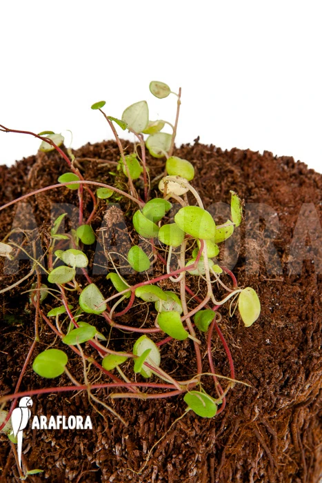 Peperomia fagerlindii has thick egg-shaped leaves with a pointed end. These are attached to thin hanging purple stems and are curled, giving them the shape of half an eggshell. The plant is found in a small area and is considered endangered. During flowering, special inflorescences emerge above the foliage. On the Peperomia fagerlindii, these resemble small white spikelets.