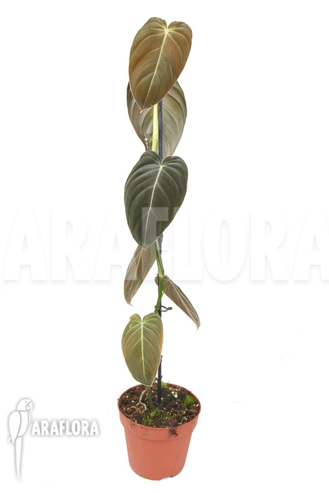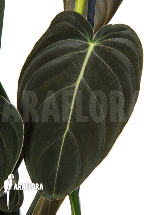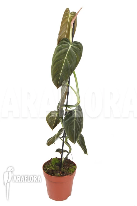 P. melanochrysum is part of the Philodendron-family which counts hundreds of different variations. The plant originates from the tropical areas of Central- and South America. P. melanochrysum is a botanical variation of the Philodendron. The plant has big, heart shaped leaves with clear, yellow vein traces. Young leaves tend to be a bit lighter and can remind of the Philodendron micans. As the leaves grow older, they will grow significantly bigger and become a lot darker. In nature the melanochrysum loves to climb on rocks and trees and can expand its height up to a few meters. Araflora sells smaller versions of the plant differing from 10 cm up to 80 cm. To support your climbing plant, use a planting stick or a wall on which it can grow.
