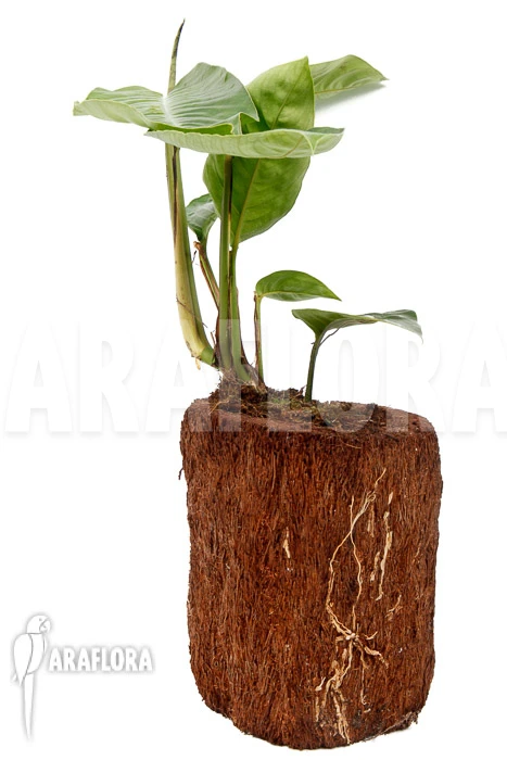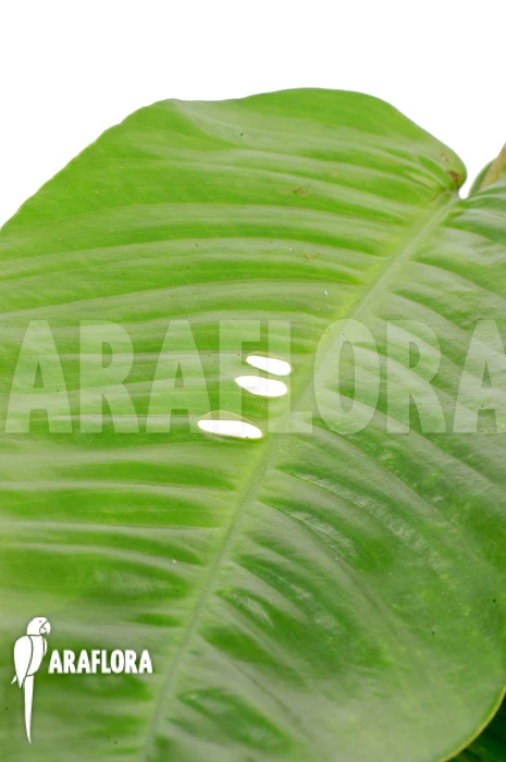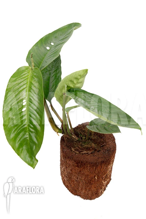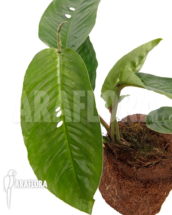 Rhaphidophora foraminifera sprouts in soil and develops along trees and rocky outcrops as a vine. This species anchors itself with aerial roots growing from its rhizome that could reach several meters in nature. The plain green leaves reach 40 cm when mature. Along the main nerve of mature leaves, two rows of perforations are formed. While this plant is mainly grown for its leaves, it could produce an occasional inflorescence. This inflorescence is similar to other aroids but then narrower.