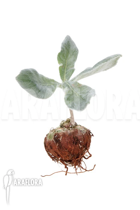 A real Brazilian plant like the Sinningia leucotricha will indeed be a conversation piece in your home. Its sturdy stalk grows straight up from the tuber, which lies partly above ground. From the top of the stalk a coronet of four large, whitish-green leaves will grow. When in flower a great number of trumpet-shaped, orange flowers will develop on top of this leafy coronet. A splendid sight to behold! Moreover taking care of the Sinningia leucotricha is really simple. Araflora is happy to explain in its plant care information section how the Sinningia leucotricha can be kept.