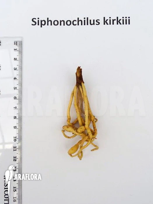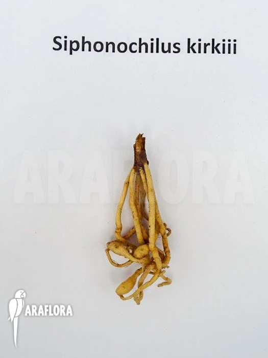 Siphonochilus kirkii is a herbaceous perennial plant that dies aboveground in nature during the dry winter months and the tuberous roots overwinter in the ground. Because the plant plays a major role in traditional medicine, it is almost extinct in the wild.